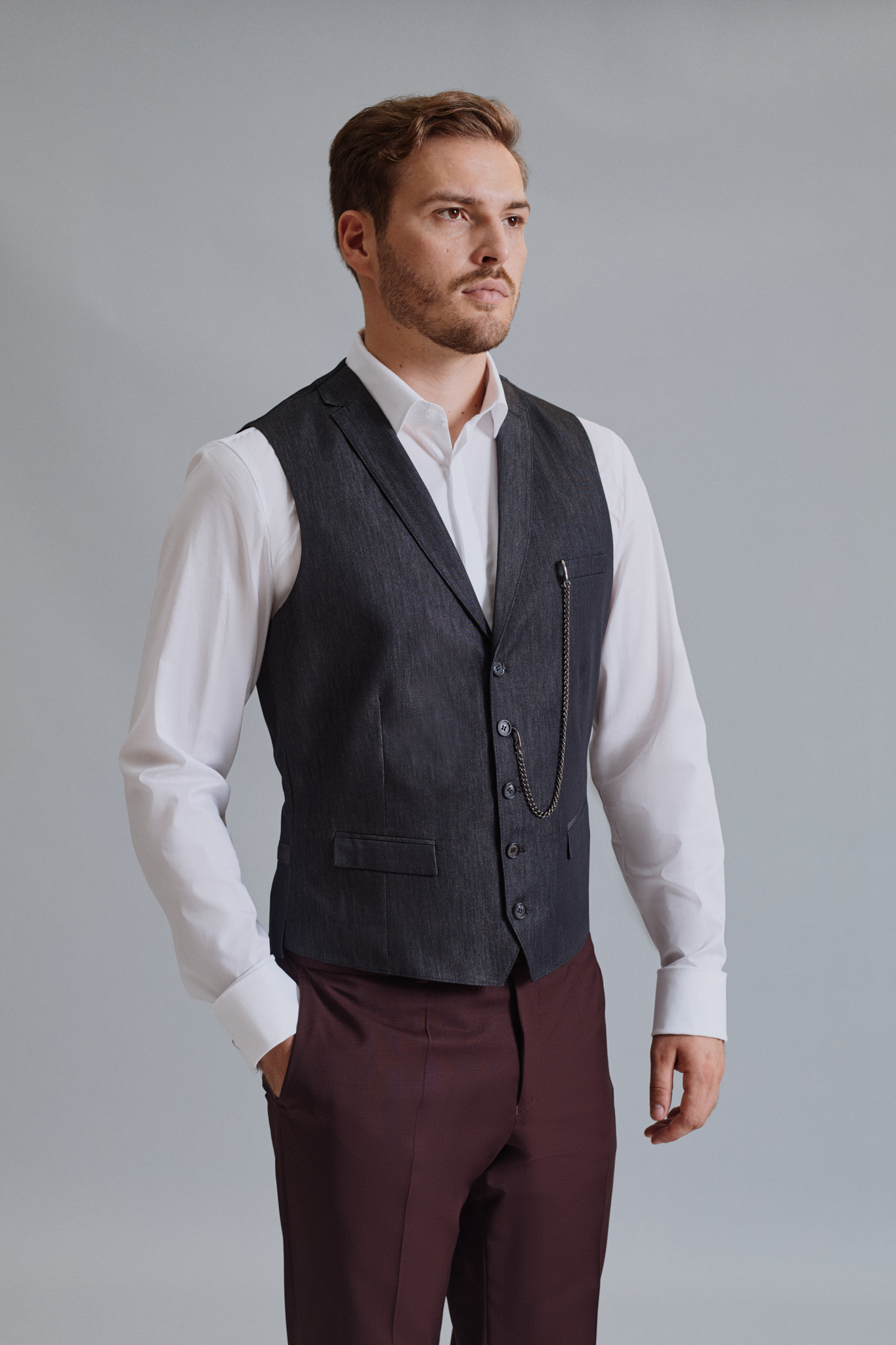 Izberite eleganco in estetiko, lahko ste celo brez kravate, a srajca naj ima vseeno skrito zapenjanje in morda tudi manšetne gumbe. Moška srajca je lahko v tonu suknjiča, lahko je bela ali bolj temno beige barve ali v modrih odtenkih in v minimalističnih vzorcih, lahko ima celo ruski ovratnik. Izogibajte pa se karo vzorcu in močnim črtam. Privoščite si živahen prsni robček, morda naramnice, če nimate telovnika, in odlične (nove) čevlje in pas, ki bodo v skladu z ostalimi modnimi dodatki. Tudi verižica na telovniku ali suknjiču bo delovala drugače in nevsakdanje. Osnova vsega pa je vaše dobro počutje. Sledite temu.