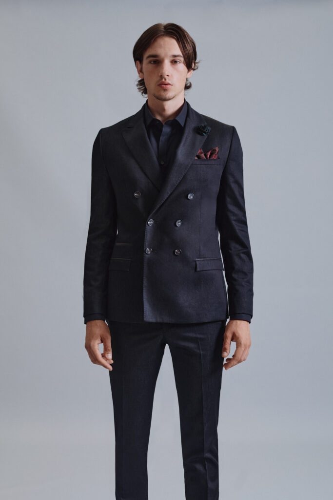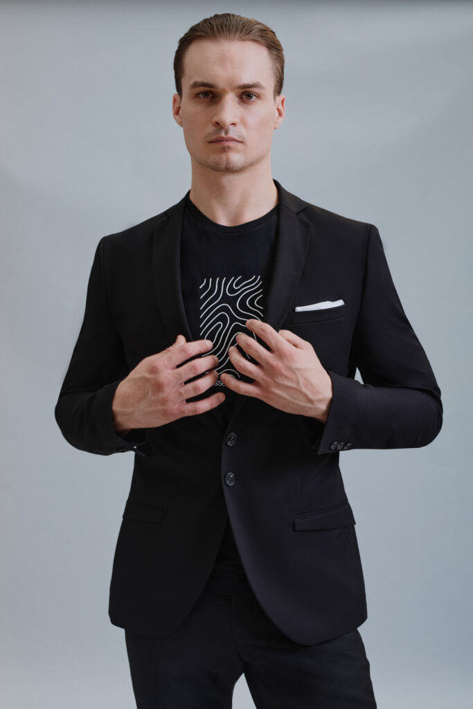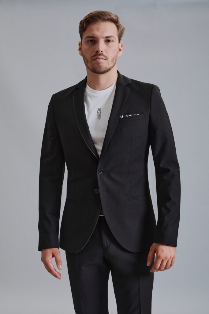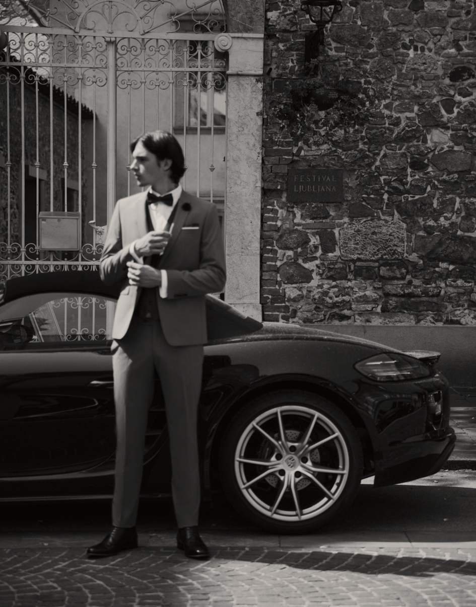 Črna je večna. Če si v dilemi kako se uskladiti s soplesalko, ti svetujemo: izberi črno in bodi zgodba zase. S tajliranim suknjičem z zopet modno špic fazono, se boš umaknil stran od klasike in poudaril svoj mladostni videz. Za piko na i ti priporočamo metuljčka iz pleksi stekla, ki s sijajem poskrbi za eleganten videz.
