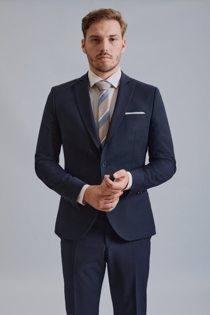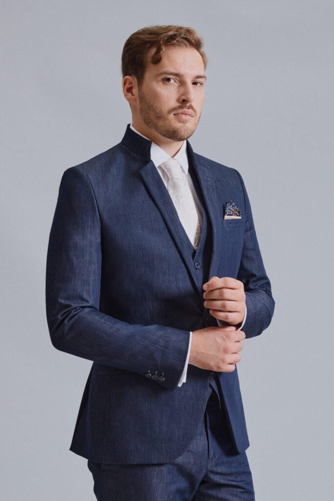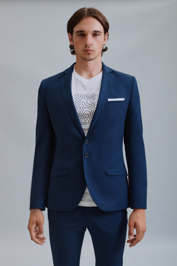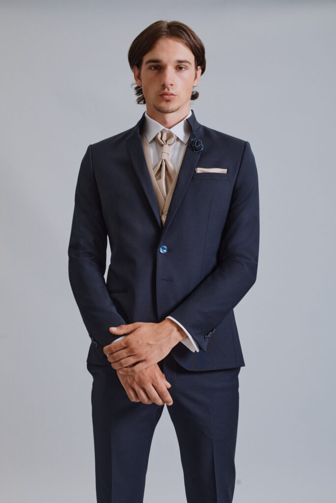 Modra še vedno ostaja najbolj trendi in zaželjena barva. S to obleko smo poskrbeli za vse ljubitelje ruskih ovratnikov: združili smo ruski ovratnik s fazono in dobili res zanimiv, trendovski videz obleke. Pri takšnem modelu moške obleke ni več težava, kako izpostaviti kravato, da bo lepo vidna.