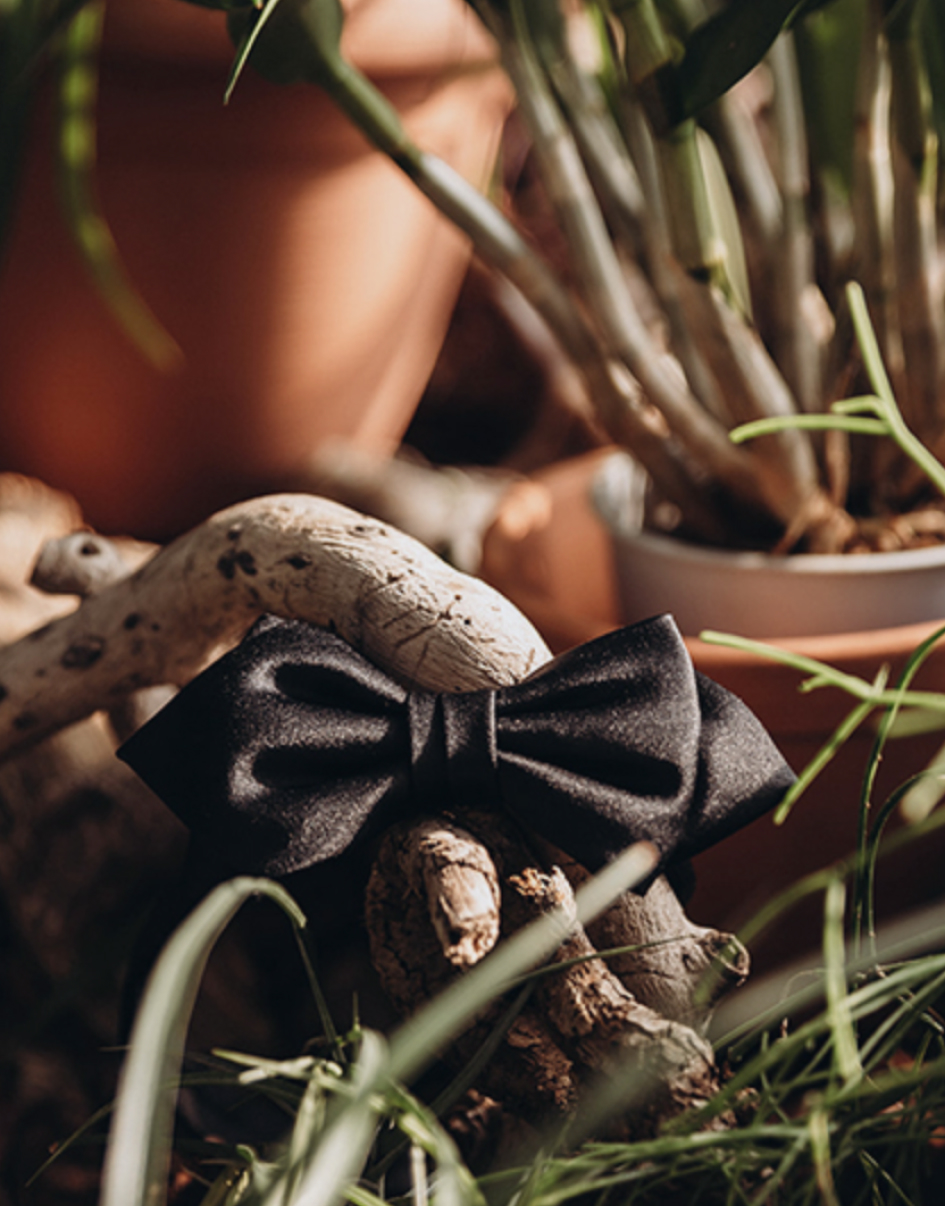 Boho stil izhaja iz indijanske kulture z elementi dobe hipijev, zato so včasih prisotni tudi indijanski dodatki. Naš ženin ima na primer pero v žepu. Oblečen je v obleko in telovnik SENS. Gre za obleko svetlo sive barve z izrazitim meliranim vzorcem, ki nakazuje ponovno moden retro stil. Obleka nosi ime Pari 20. Zraven smo kombinirali telovnik iz enake tkanine. K takšnemu stajlingu s črnim metuljčkom pristajajo črni moški čevlji in črn pas, srajca pa se ujema z barvo nevestine obleke: