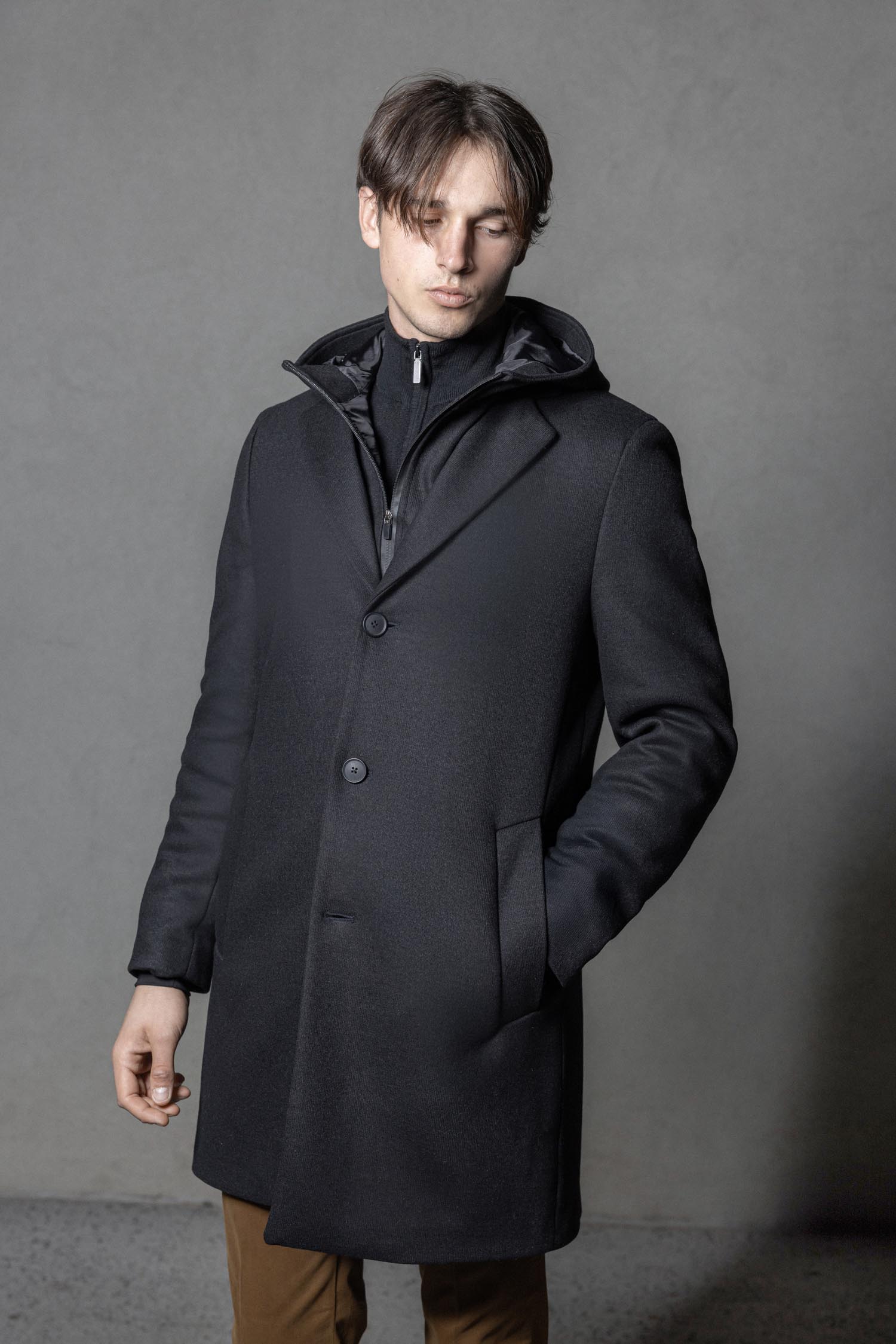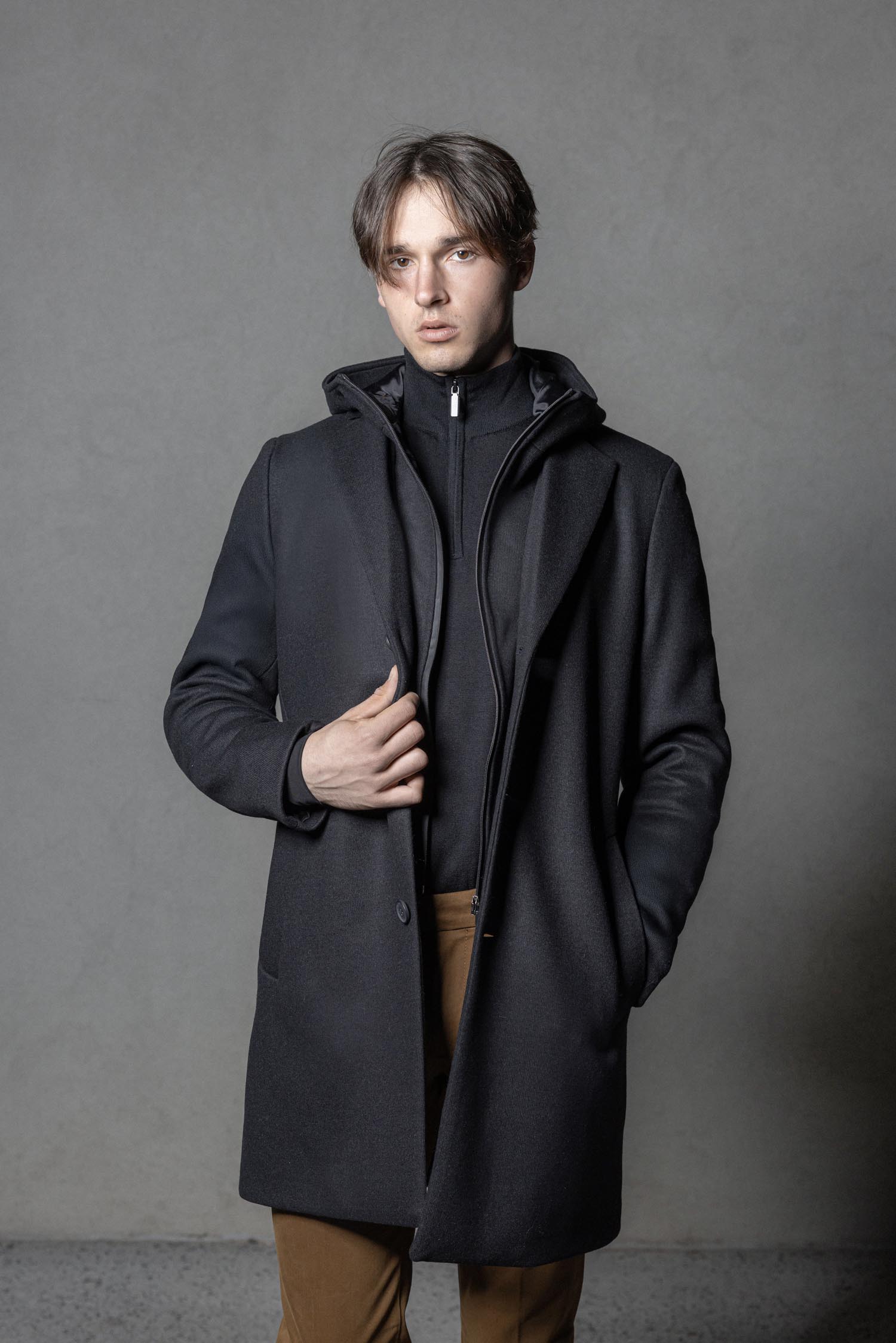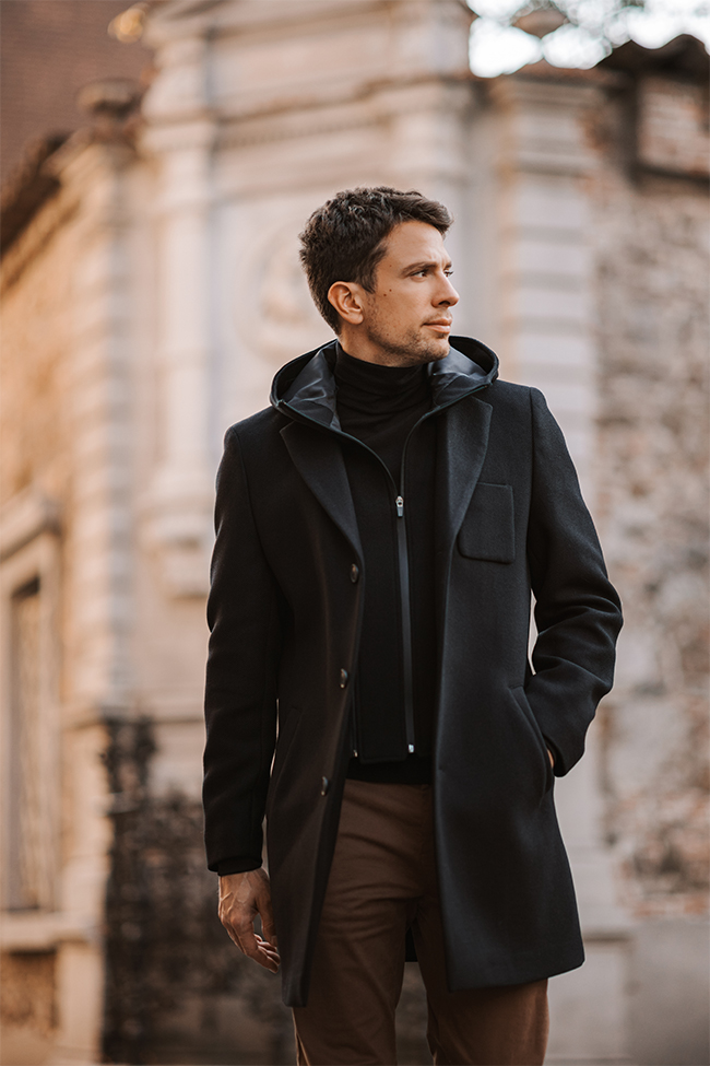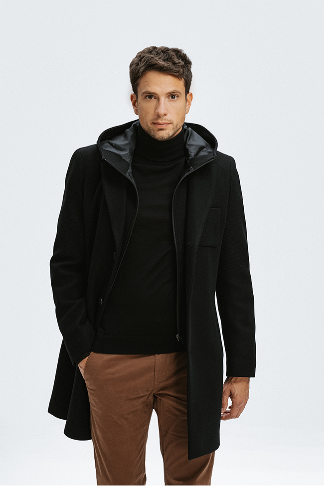 MOŠKI ČRN PLAŠČ Z ODSTRANLJIVO KAPUCO