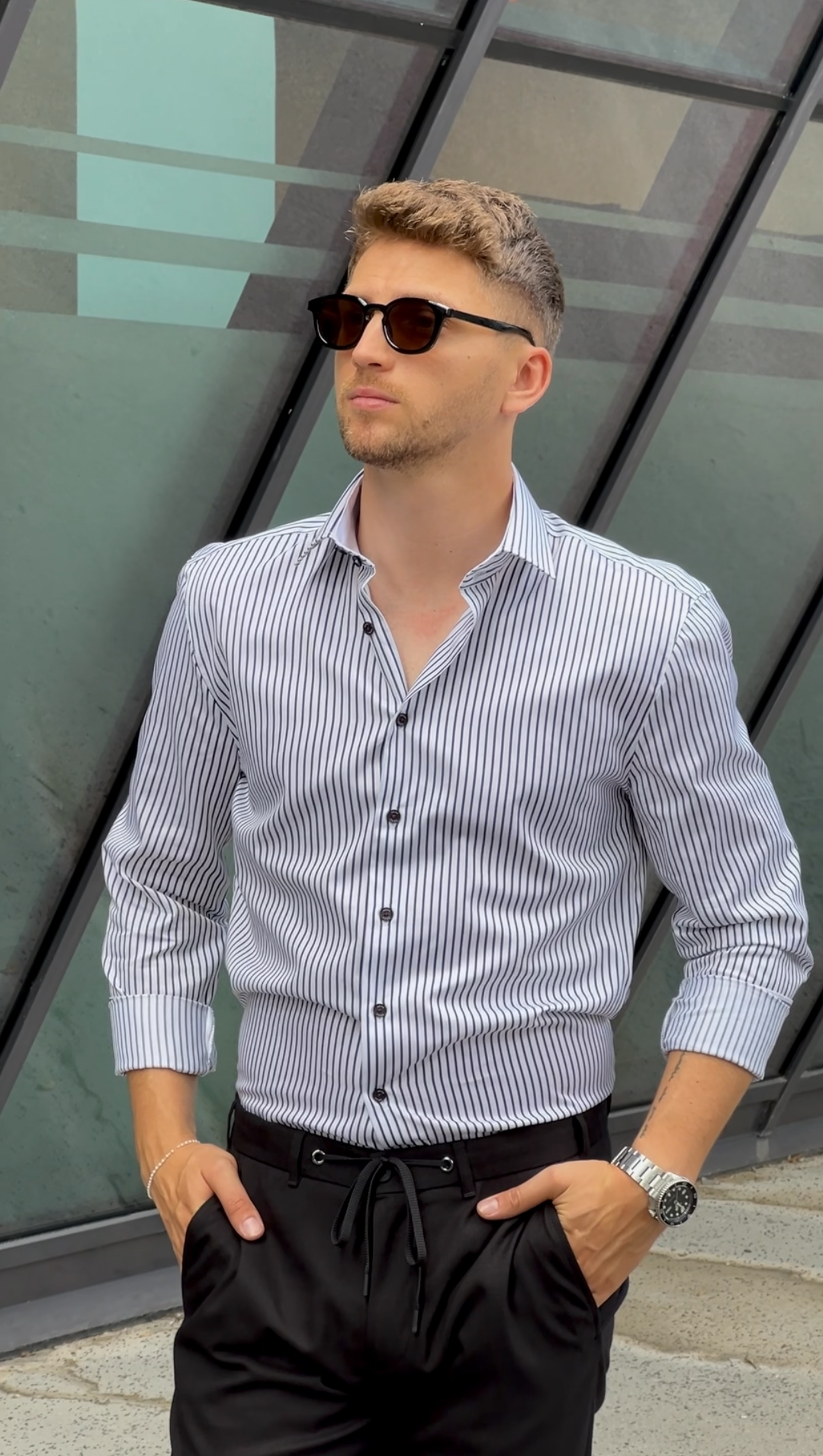 Srajca se odlično kombinira s črnimi, bež ali sivimi hlačami – tako klasičnimi kot sproščenimi modeli. Za poletne dni jo lahko nosite tudi z zavihanimi rokavi, kot je prikazano na fotografiji, kar še poudari njen moderen značaj.