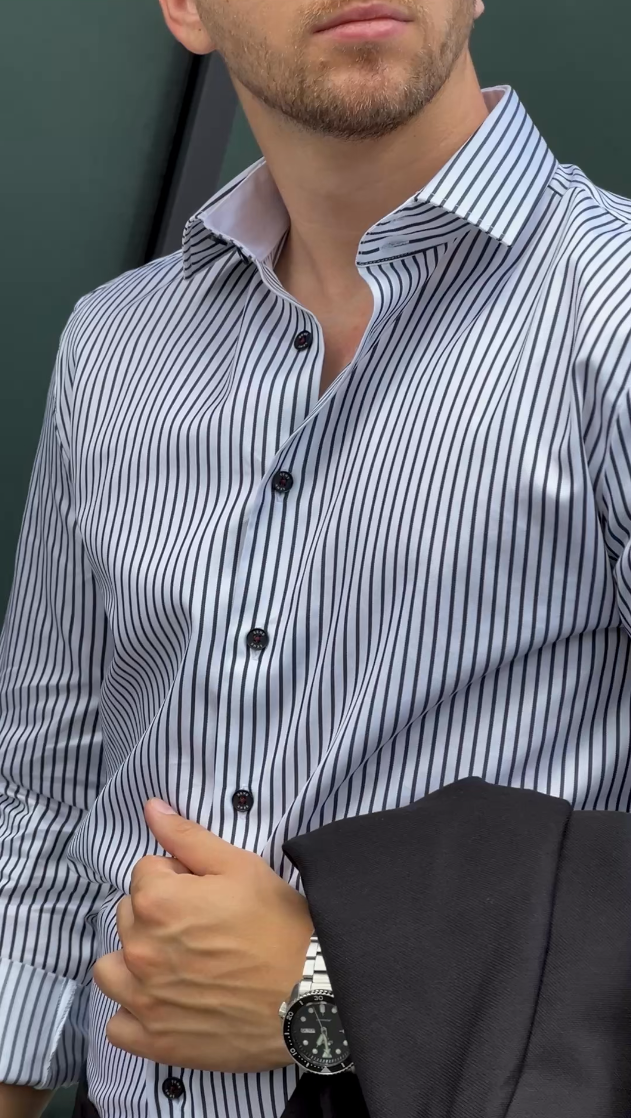 Elegantna moška srajca s črnimi navpičnimi črtami na beli podlagi je brezčasen kos garderobe, ki združuje klasičen slog z modernim prileganjem. Izdelana je iz 100% kakovostnega bombaža, ki nudi udobje, zračnost in ravno prav strukturiran videz – idealna za celodnevno nošenje.