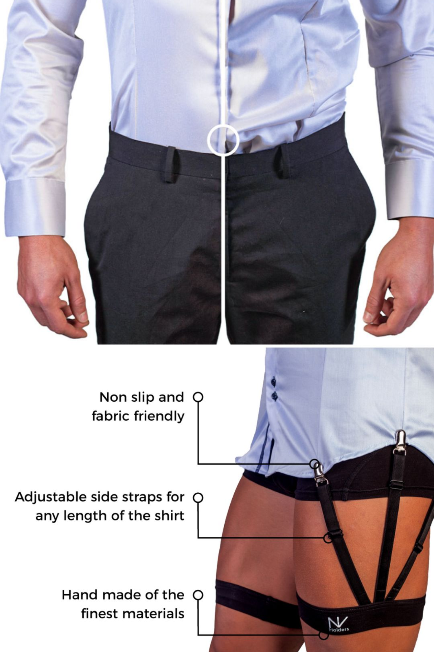 Držalo za srajce NV Holders je nepogrešljiv pripomoček za vse, ki želijo ohraniti urejen videz skozi cel dan. Vaša srajca bo ostala na mestu, brez gubanja, vihanja ali zdrsovanja iz hlač. Ne glede na to, ali sedite, hodite ali se nagibate – vaša srajca bo vedno ostala brezhibna.