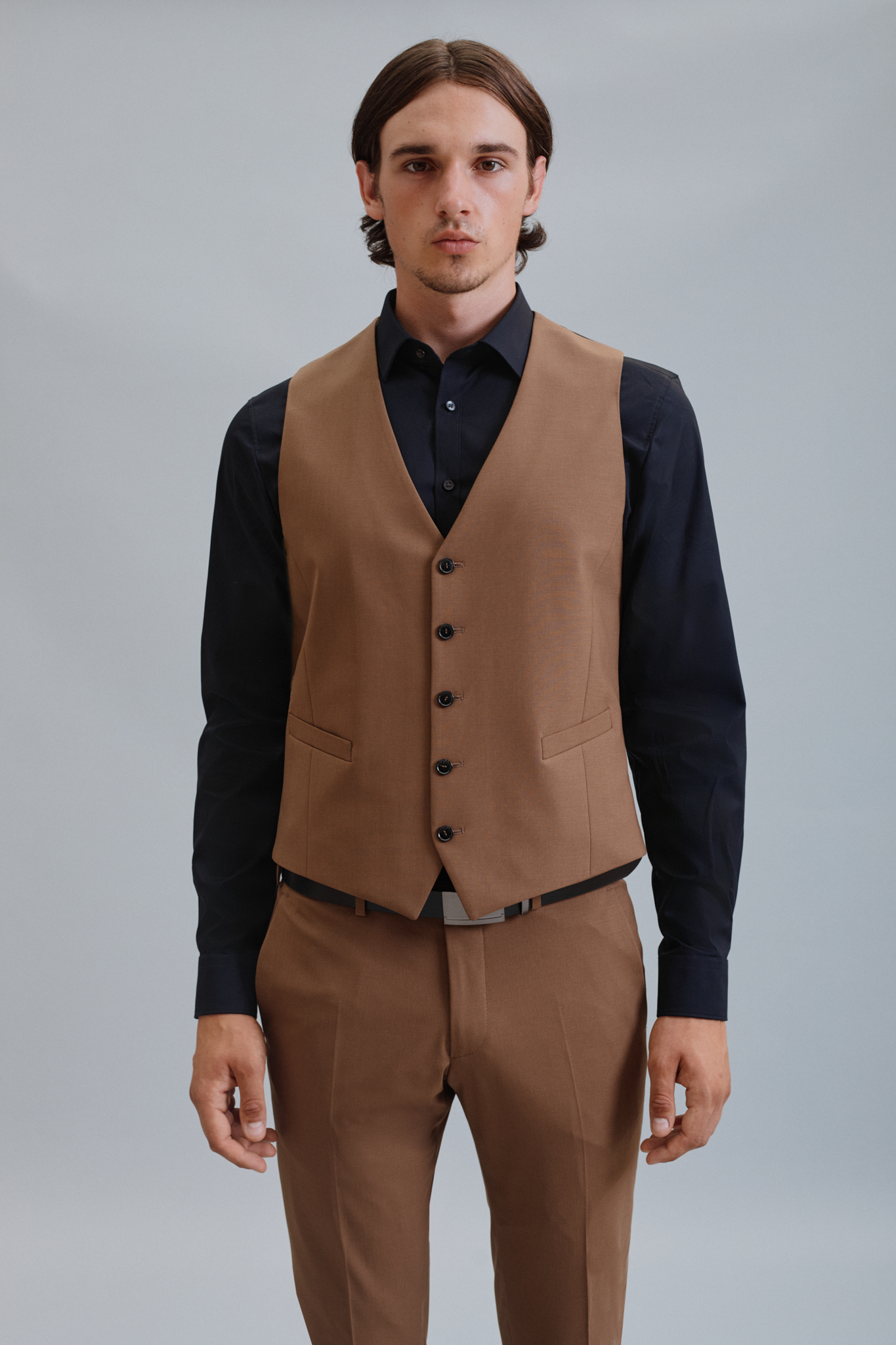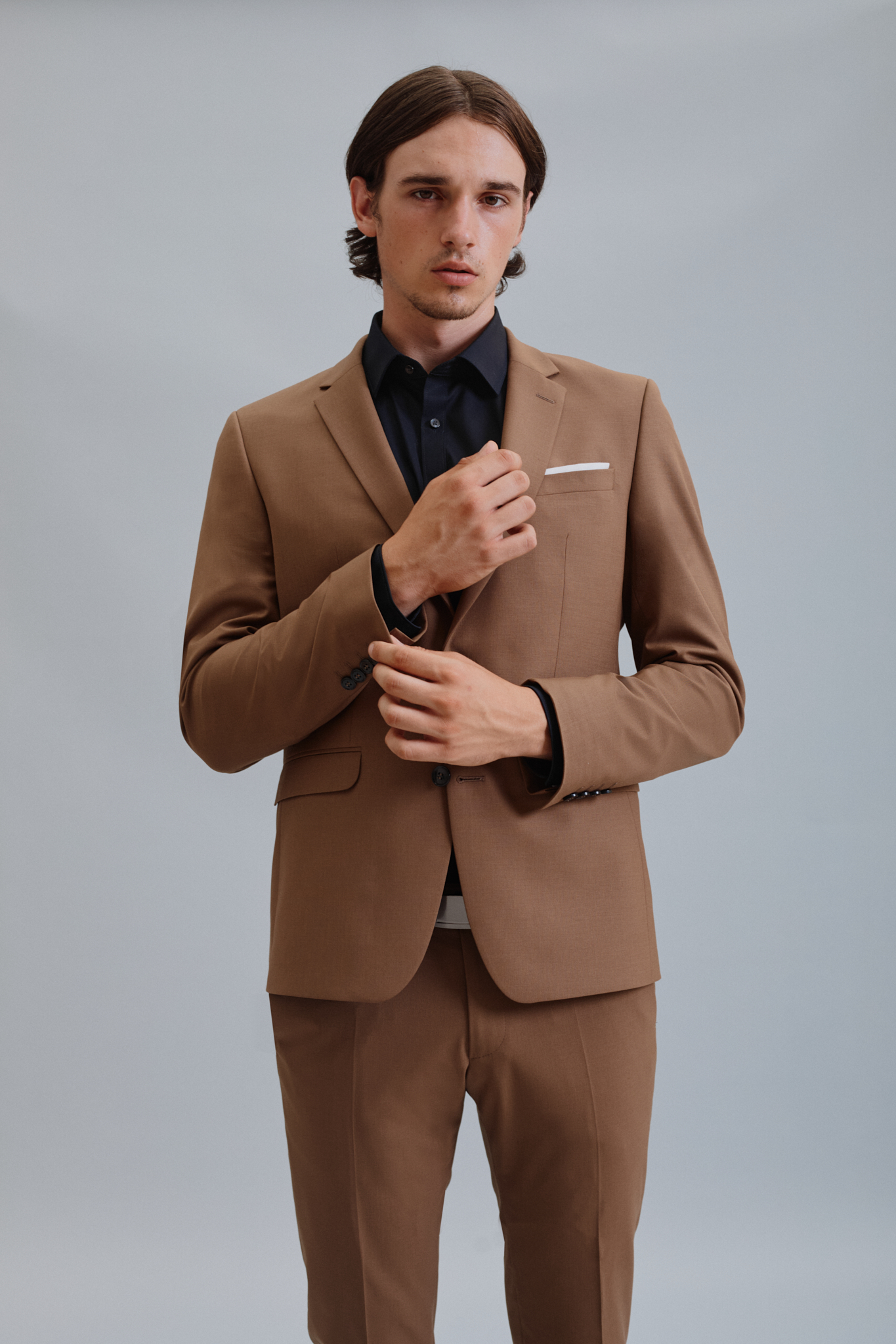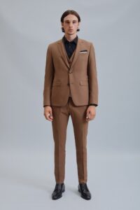 Suknjič je izdelan iz rjave (oker) tkanine, odporne proti mečkanju. Je modnega slim kroja in ima karo fazono. Primeren je za posebne priložnosti.