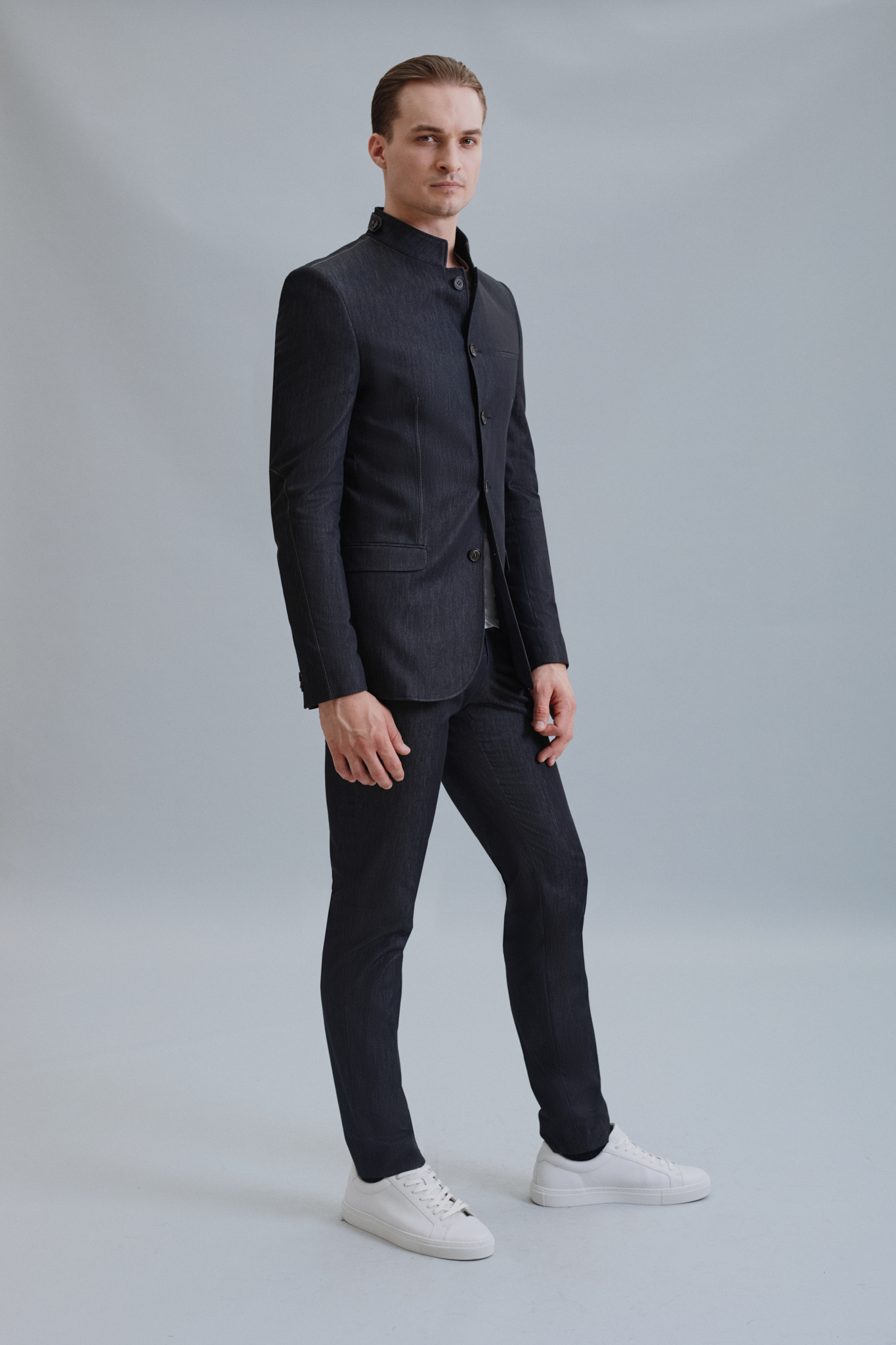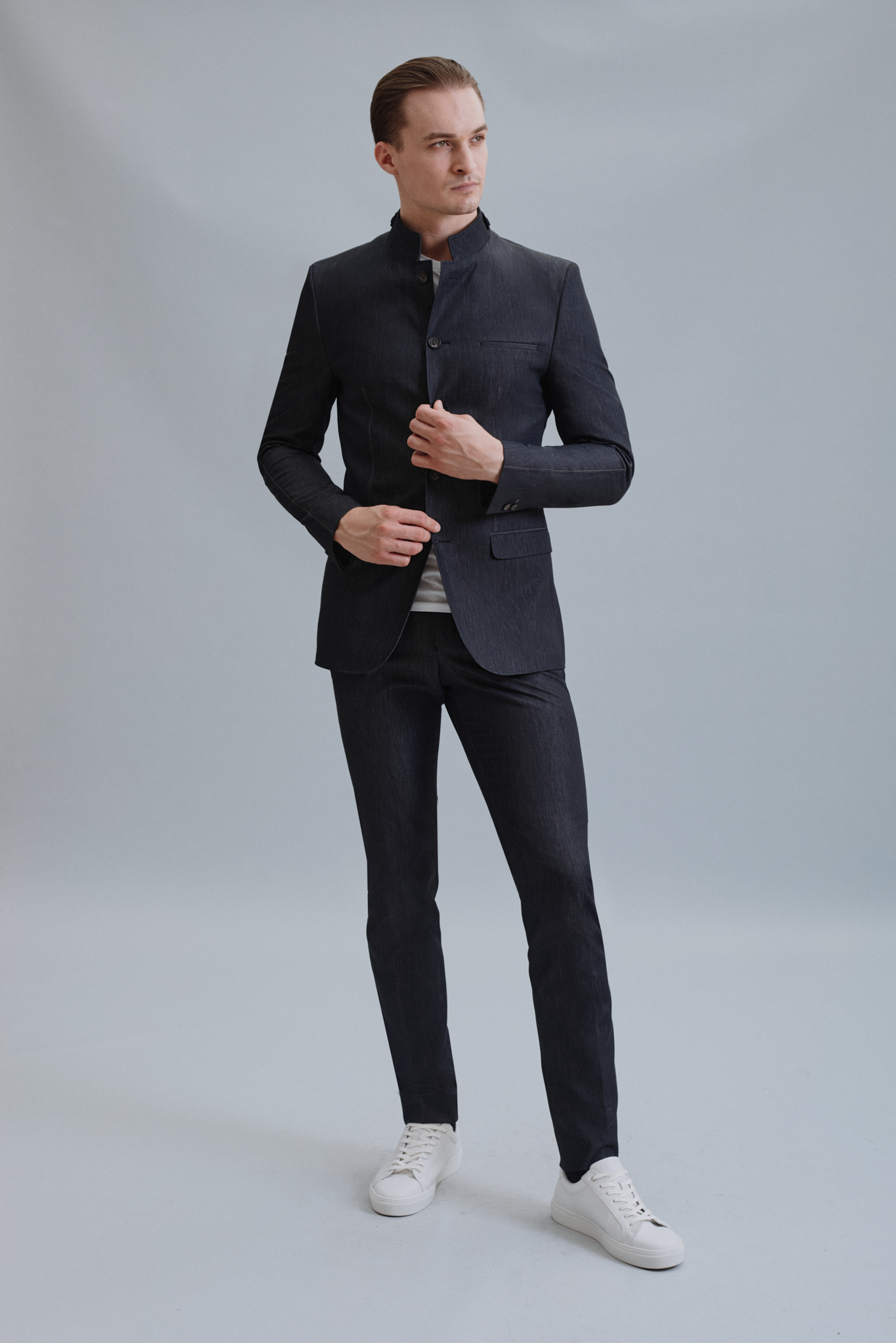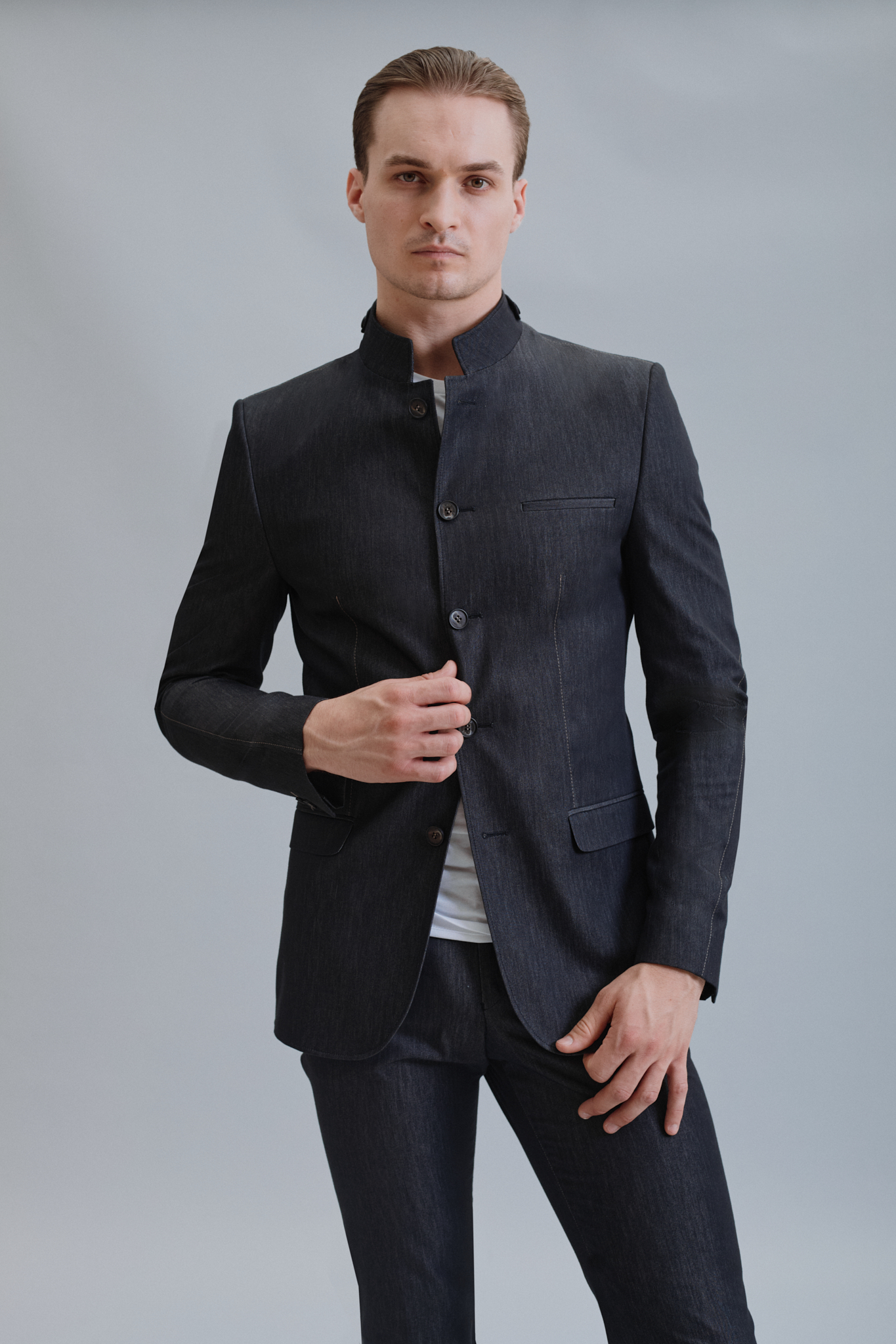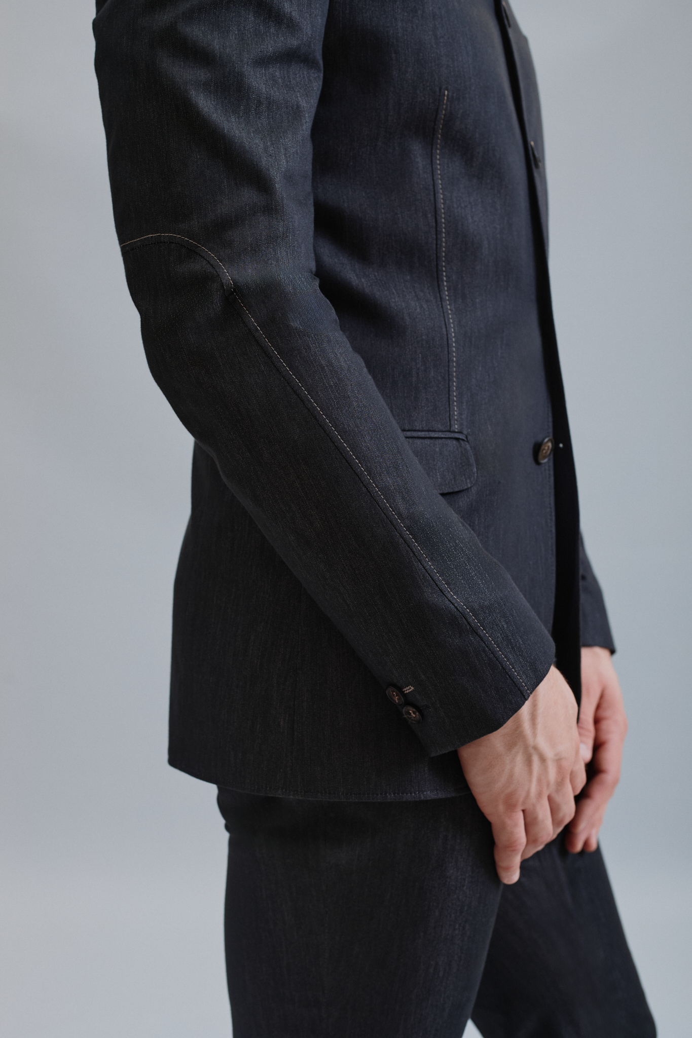 Suknjič je narejen iz elegantnega sivega jeansa z vidnimi okrasnimi štepami. Krasijo ga različni detajli, kot so posebni žepi, štepe in rezi na rokavu. Namenjen je vsem dnevnim priložnostim.